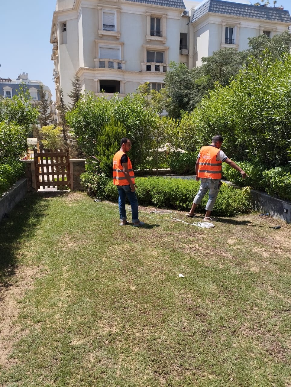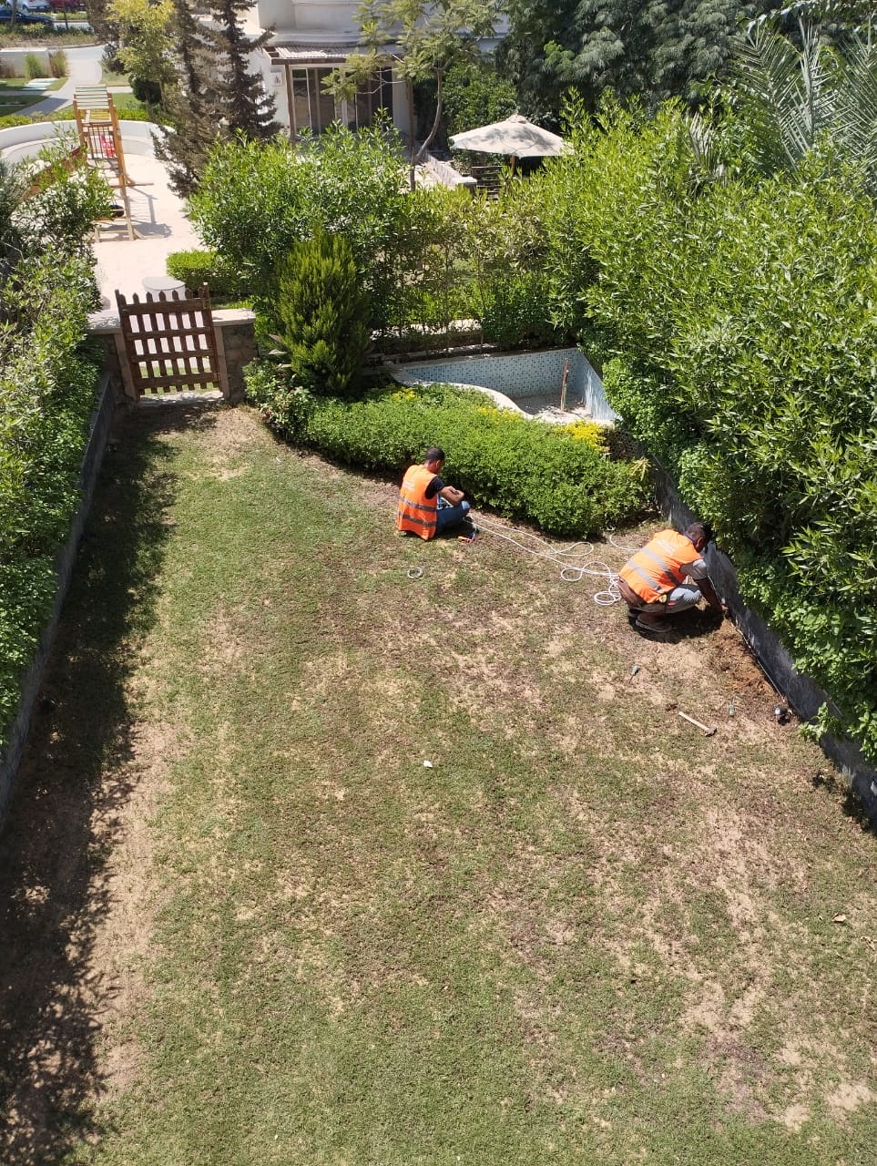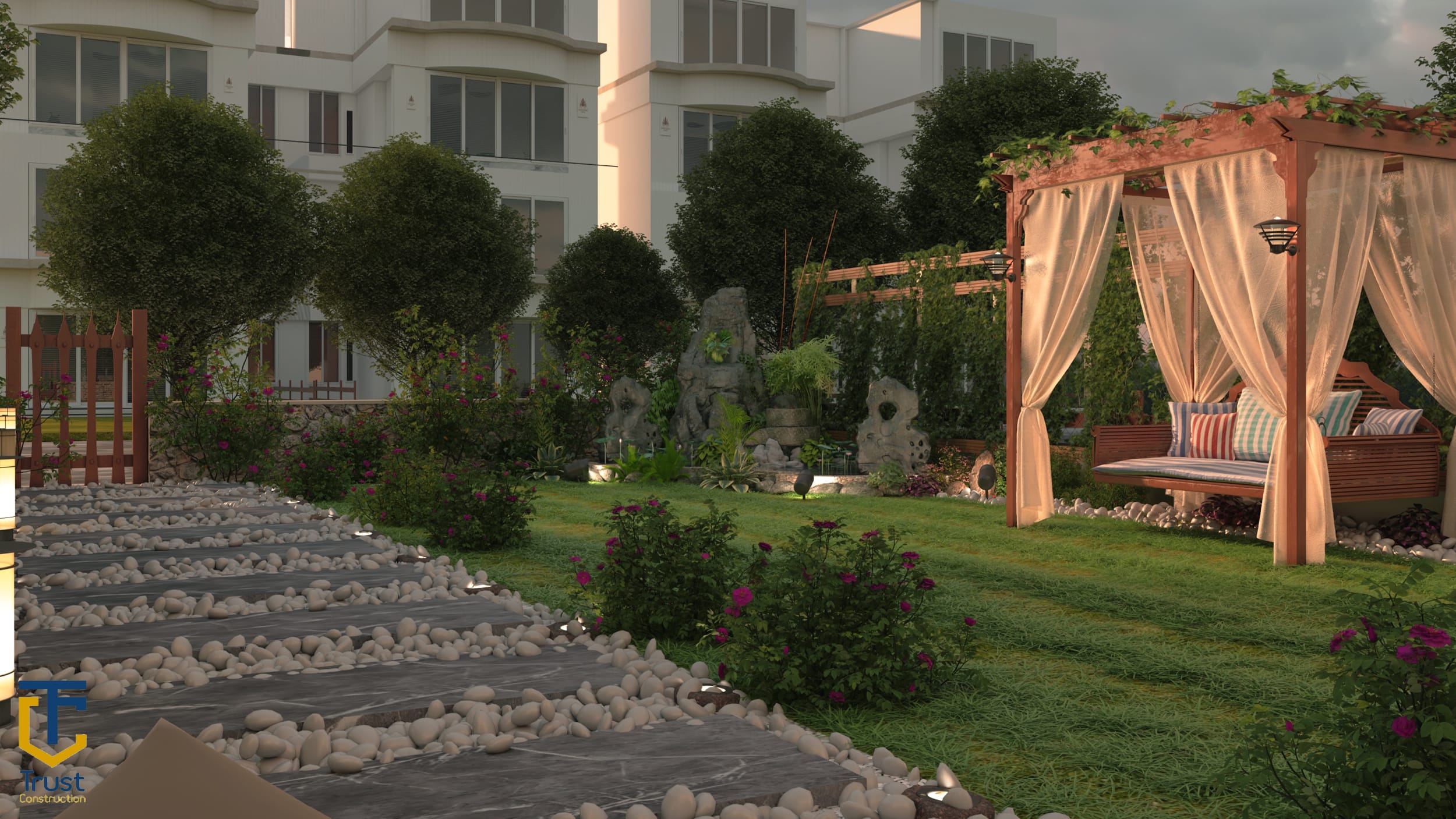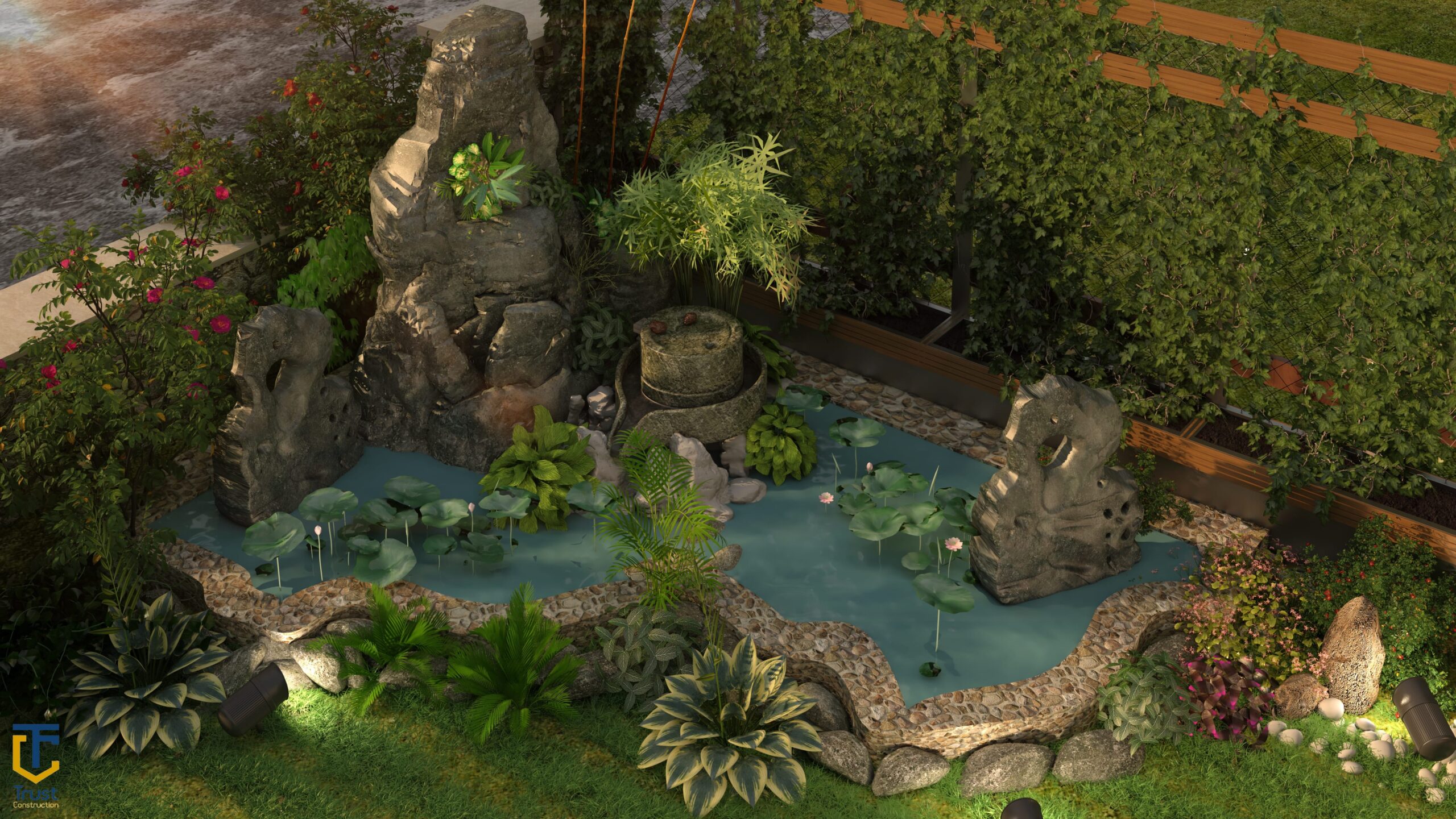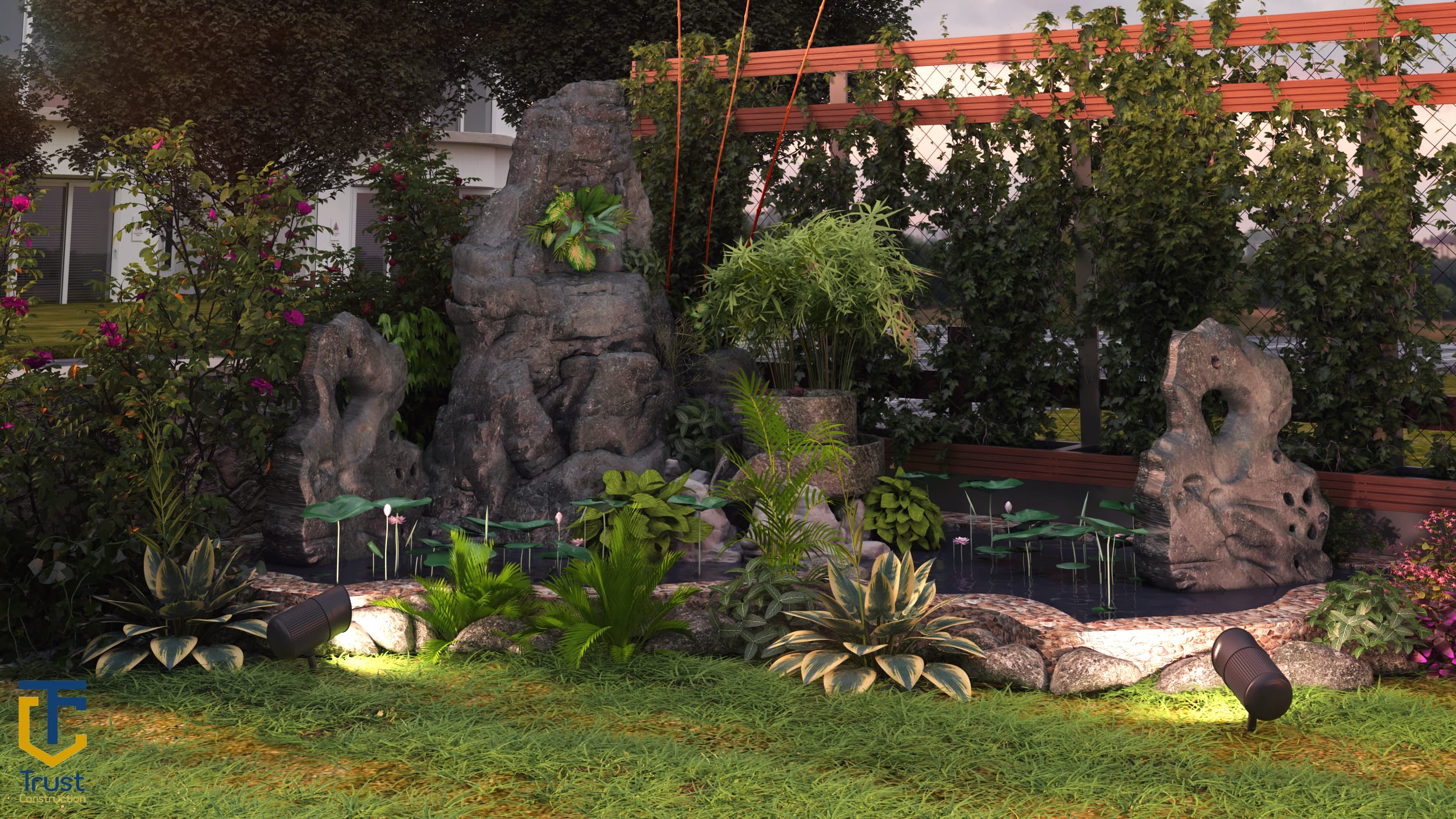 Landscaped outdoor area of 60 sqm, featuring natural trees, real grass, and a decorative water fountain